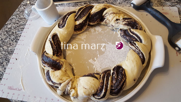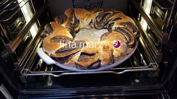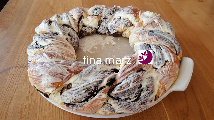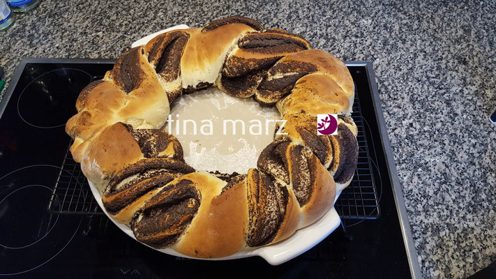 Ich habe das AGRILUNA-Mohnschnecken Rezept x2 genommen und daraus einen XXL-Mohnkranz gezaubert.